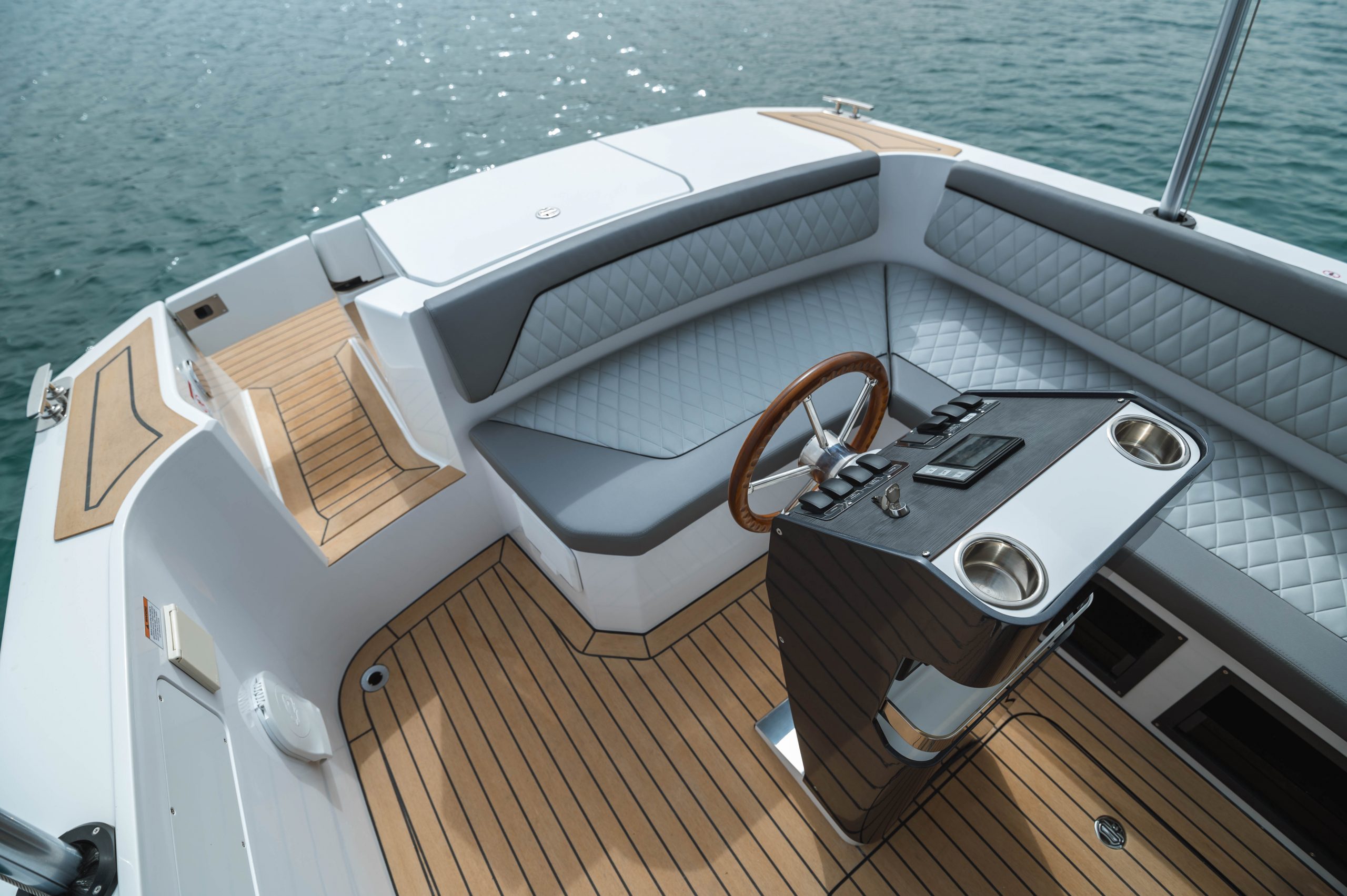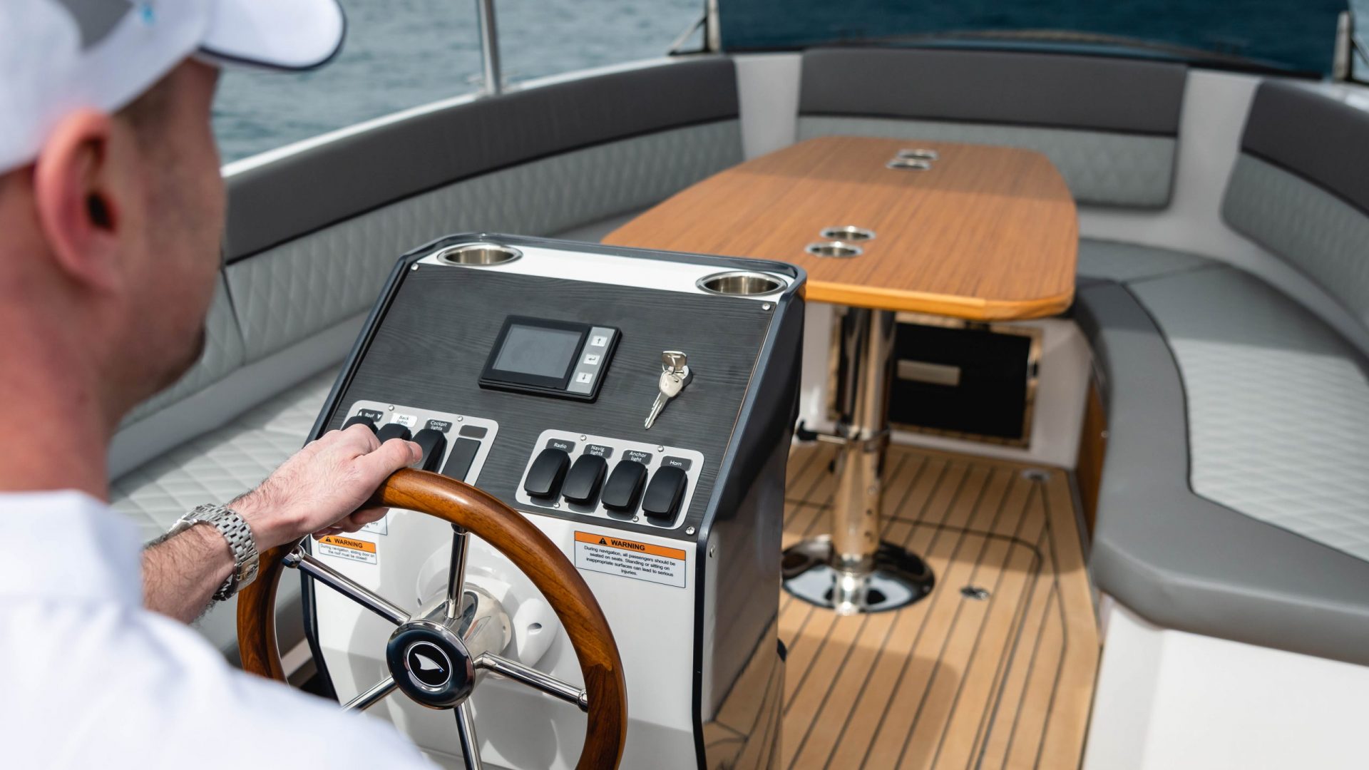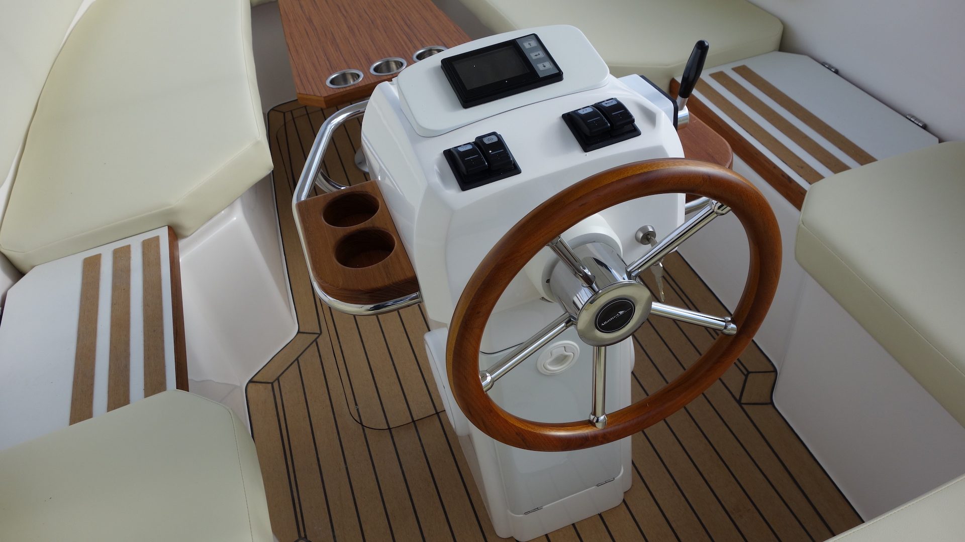 The design of the console was well studied to implement all the necessary instruments and maintaining the timeless appearance without losing the comfort. The helm console can be mounted centrally or laterally, allowing to walk around inside the cockpit.
