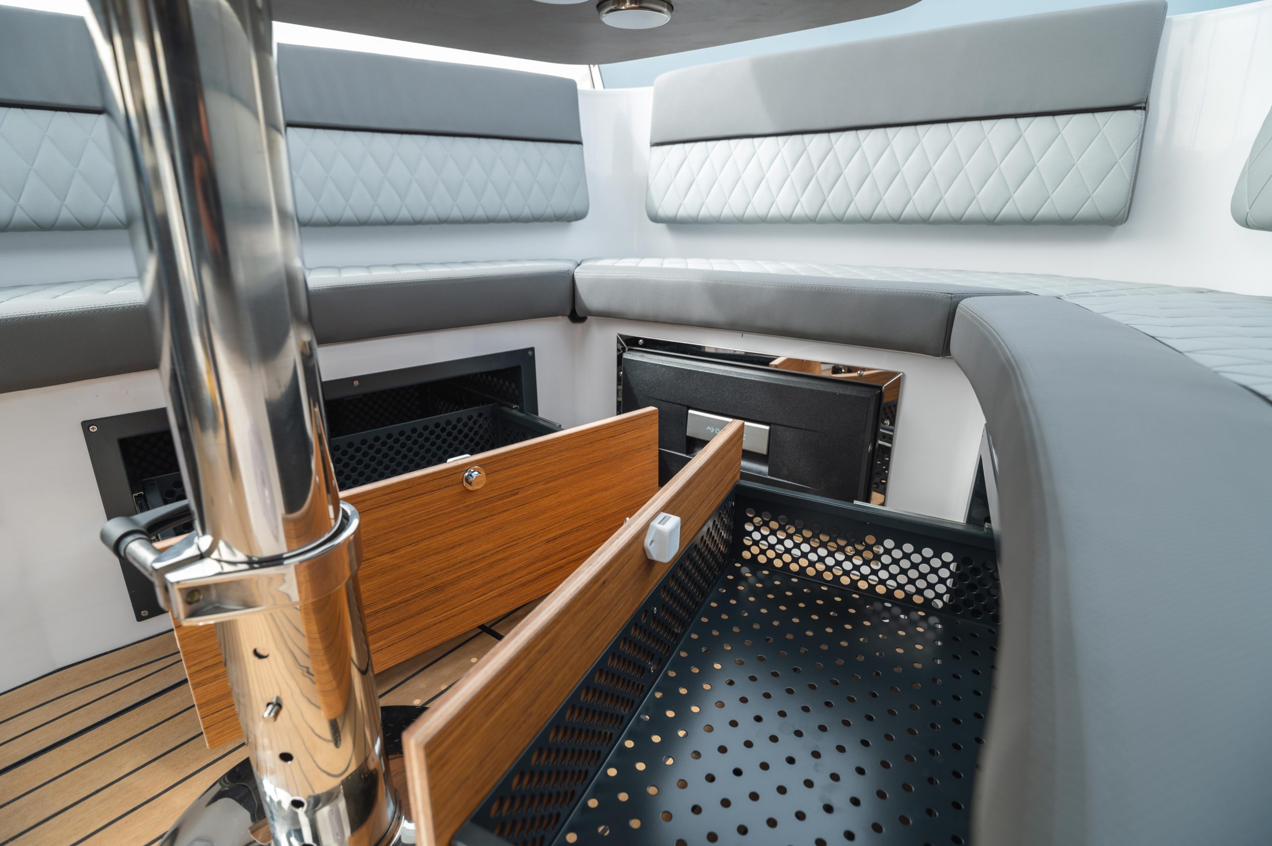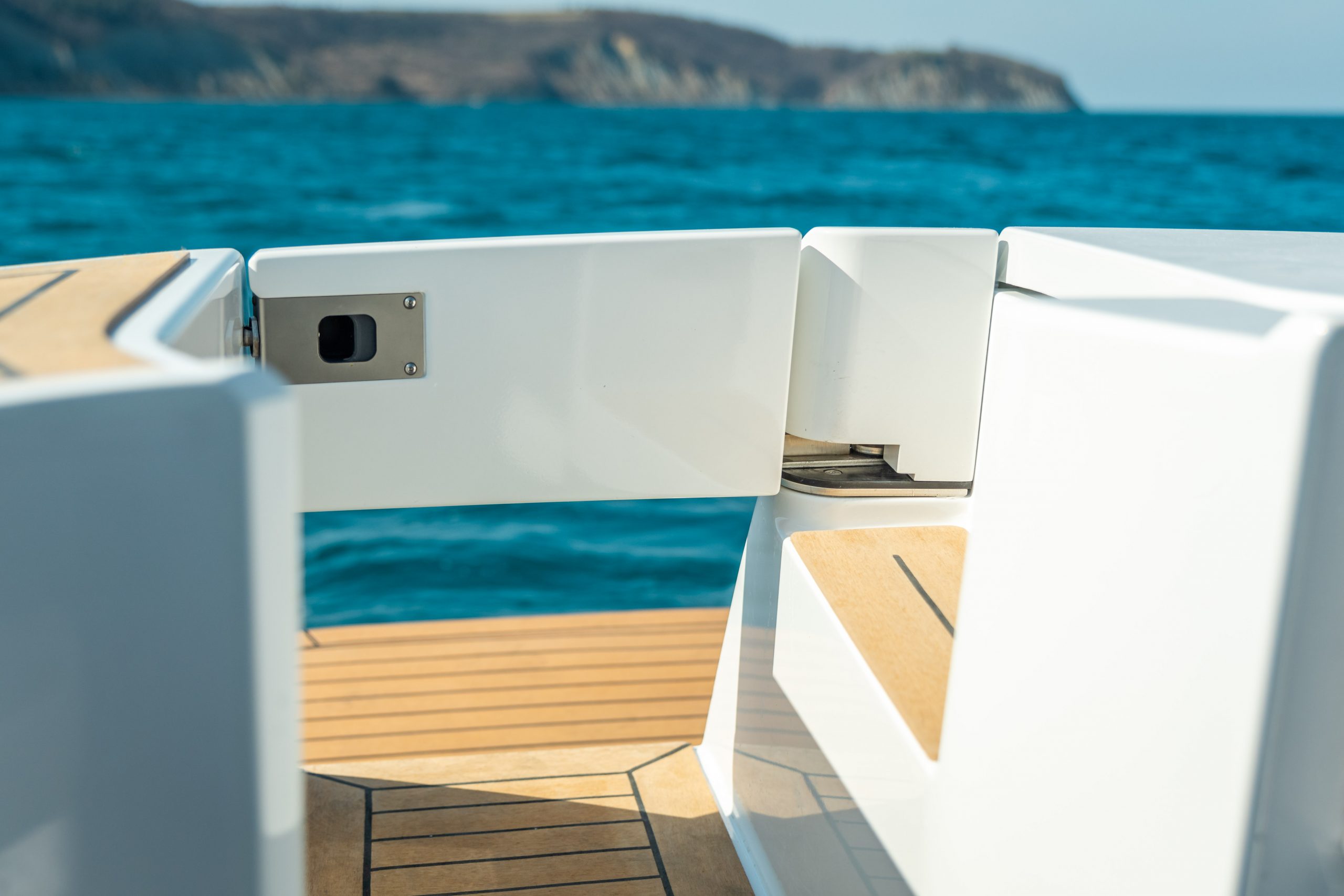 Easy and safe access is provided by one side rear entrance that is protected with the design doors to ensure additional safety on board. Alfastreet Marine design is authentic and details are visible everywhere.
