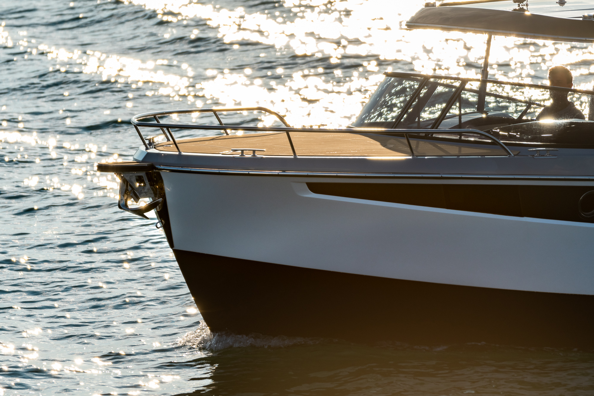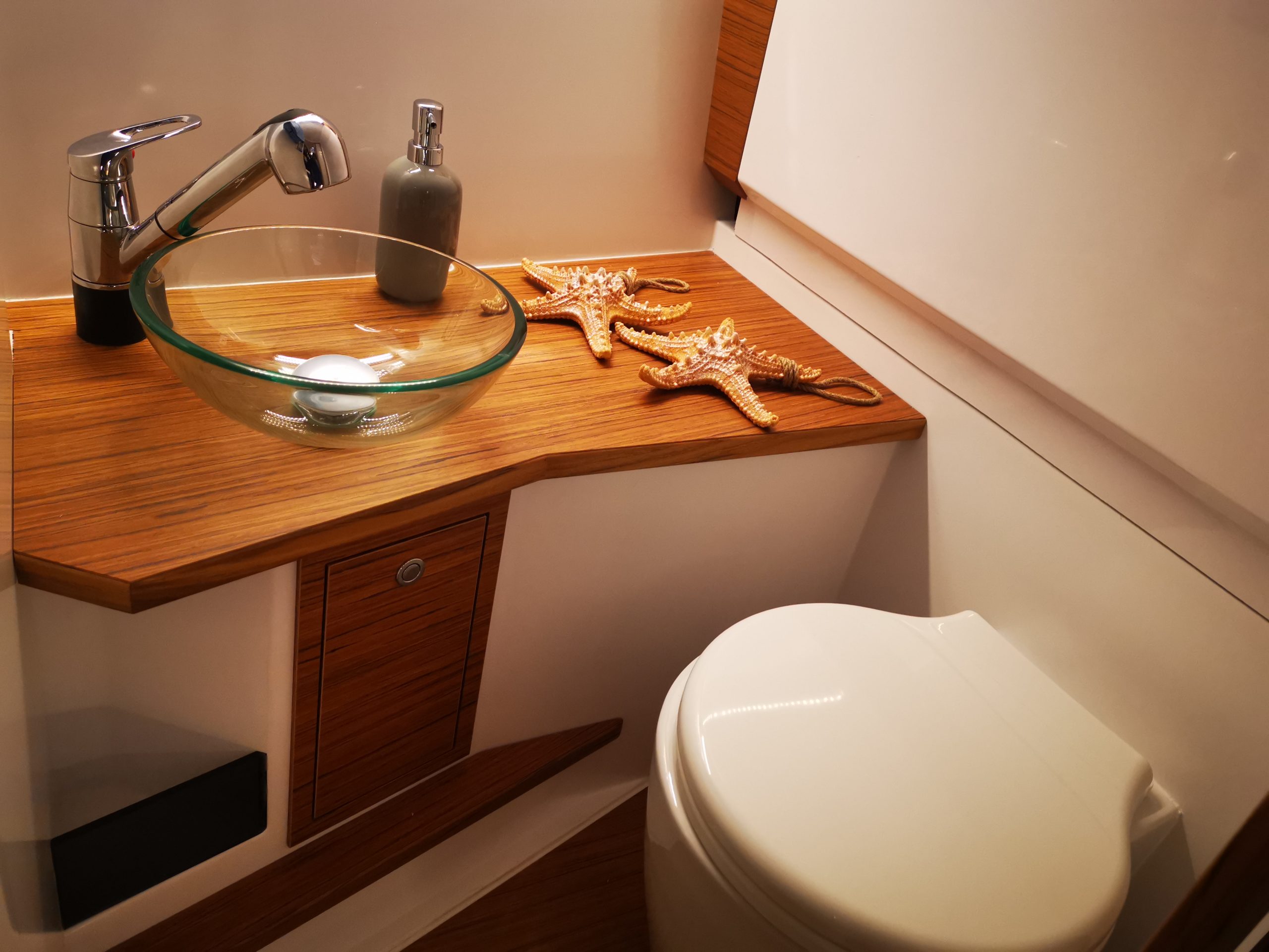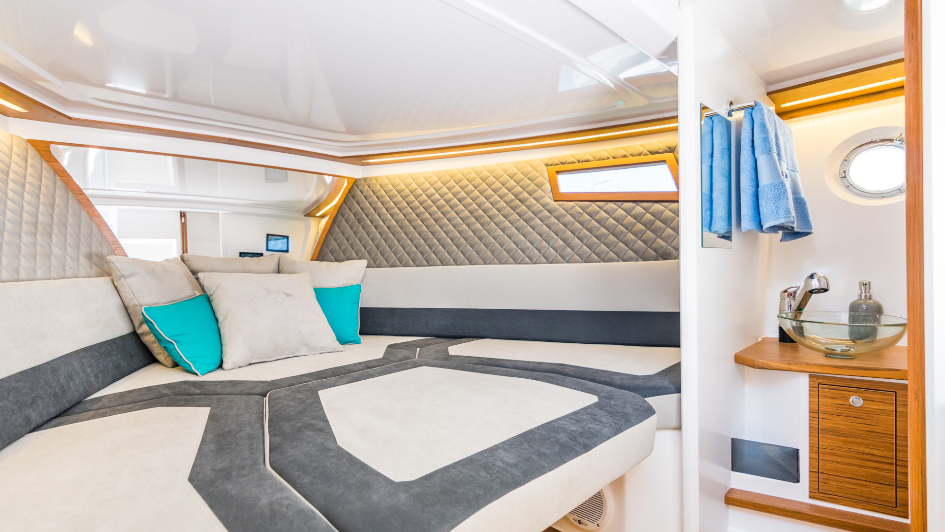 This model offers the most spacious cabin with a comfortable king size bed, a separate small bathroom and a practical closet. Access from the cockpit is easy and secure for maximum comfort and movement around the cabin. The elegant, blacked-out side windows offer great expansive views and provide daylight illumination. Attention to detail is evident throughout and you will feel right at home enjoying the night.
