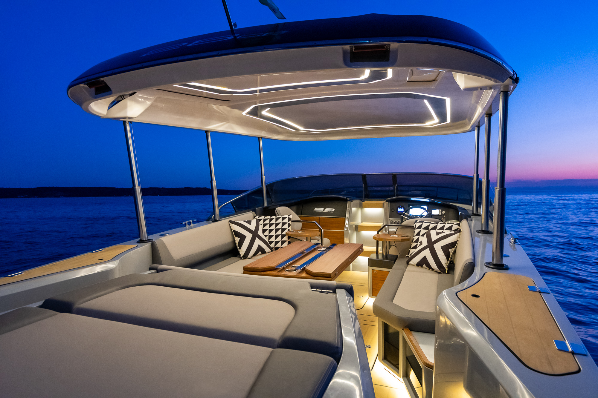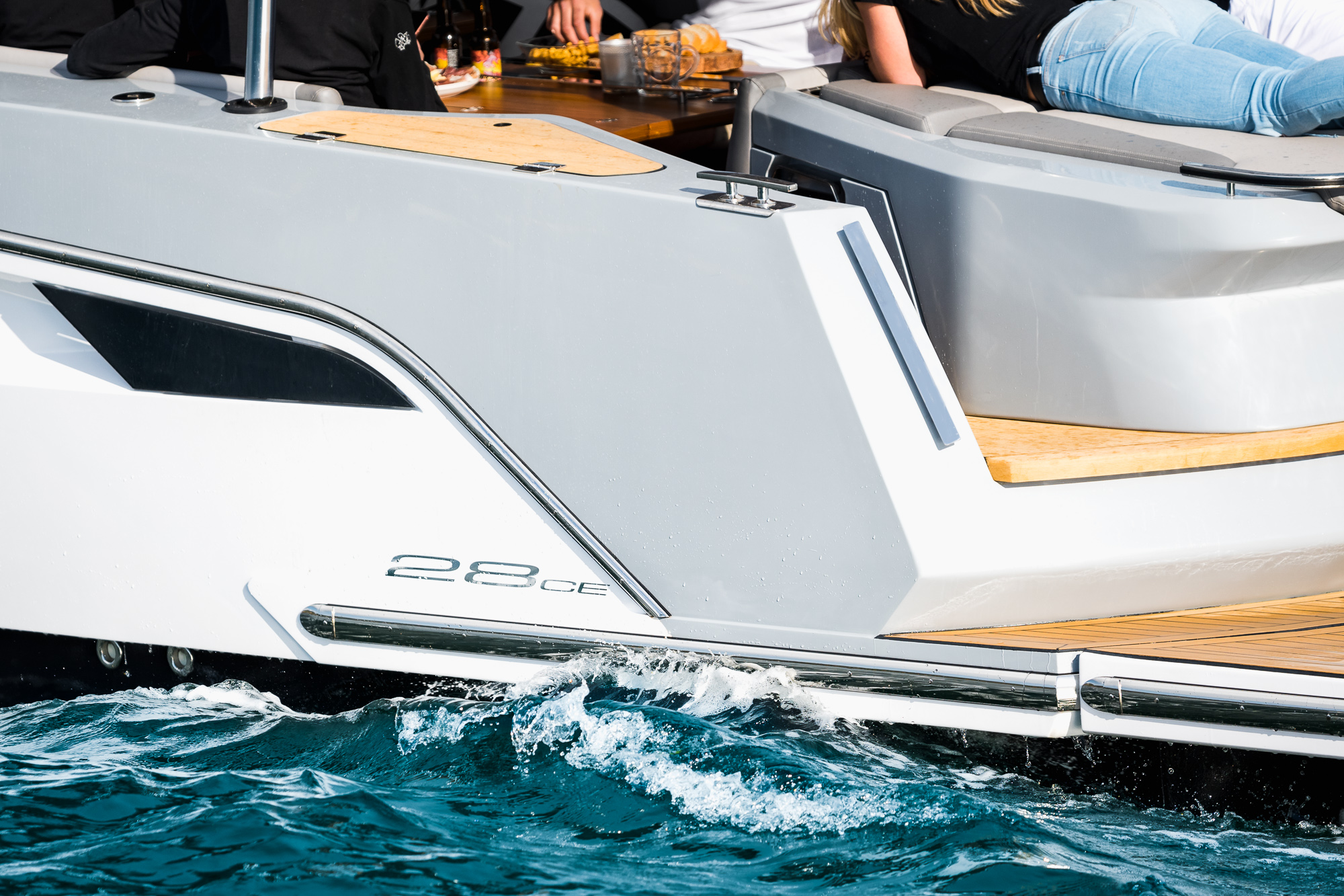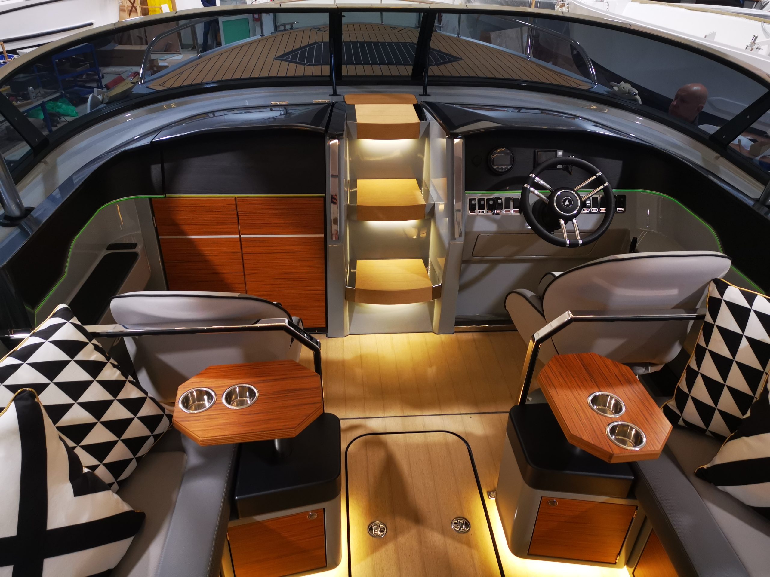 Certainly the 28's front console is something not to be missed, with all the custom detailing to make you feel like you're in a convertible. The well thought out positioning of all the instruments on the wooden inserts, the padded sides in the premium marine upholstery and the indirect lighting make the 28ft model a recognizable, timeless and appealing vessel.