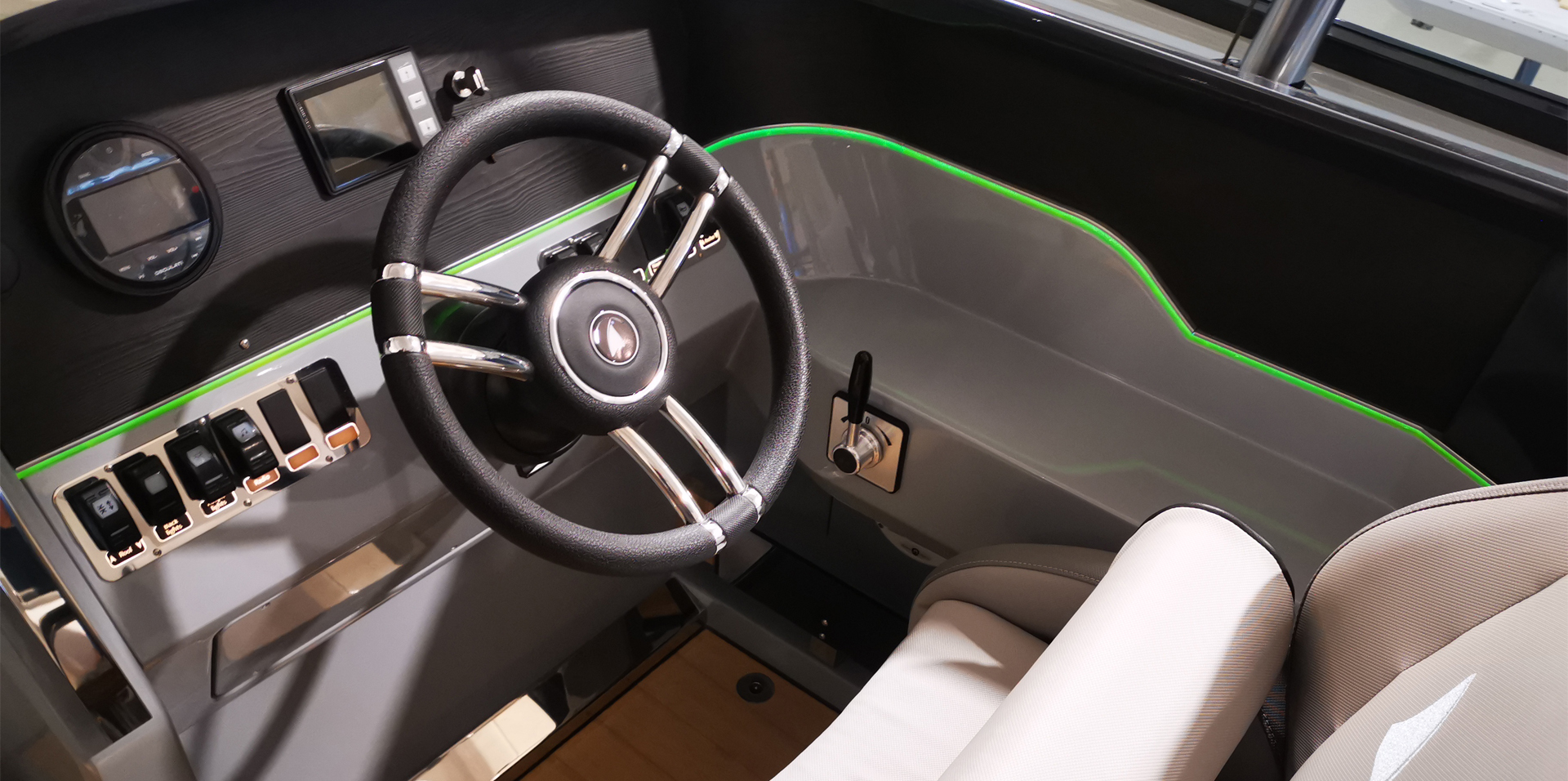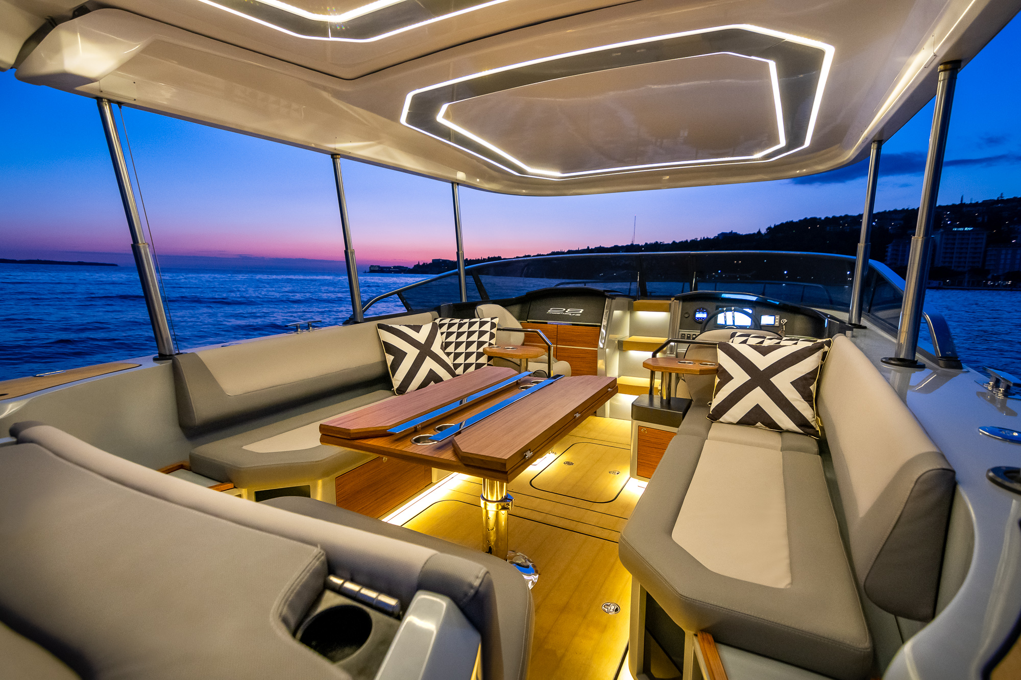 This model is different because it features a special Led technology ambient illumination to enjoy on the boat also at night while enjoying a moment with your family or friends. Illuminated front console, seats, and entrance provide an indirect lightning for a romantic and relaxed atmosphere.