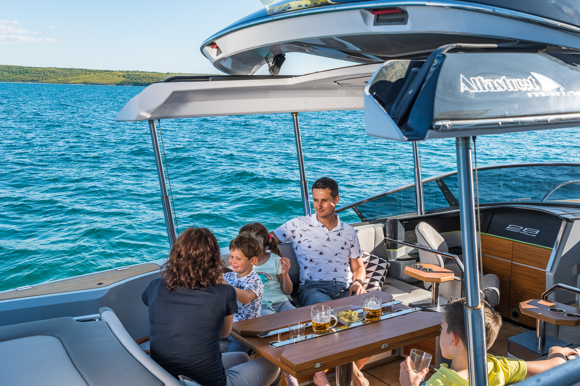 Easy and safe access is provided by the two side rear entrances that are protected with the doors to ensure additional safety on board. The remote operated hydraulic hard top features an additional spacious sliding door to simplify the entrance to and from the cockpit.
