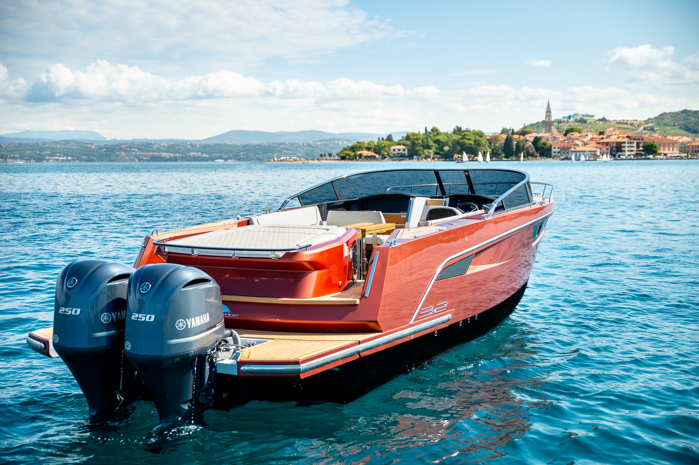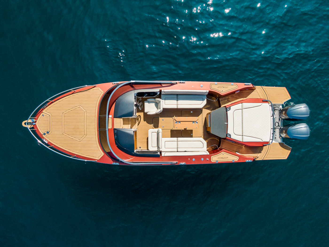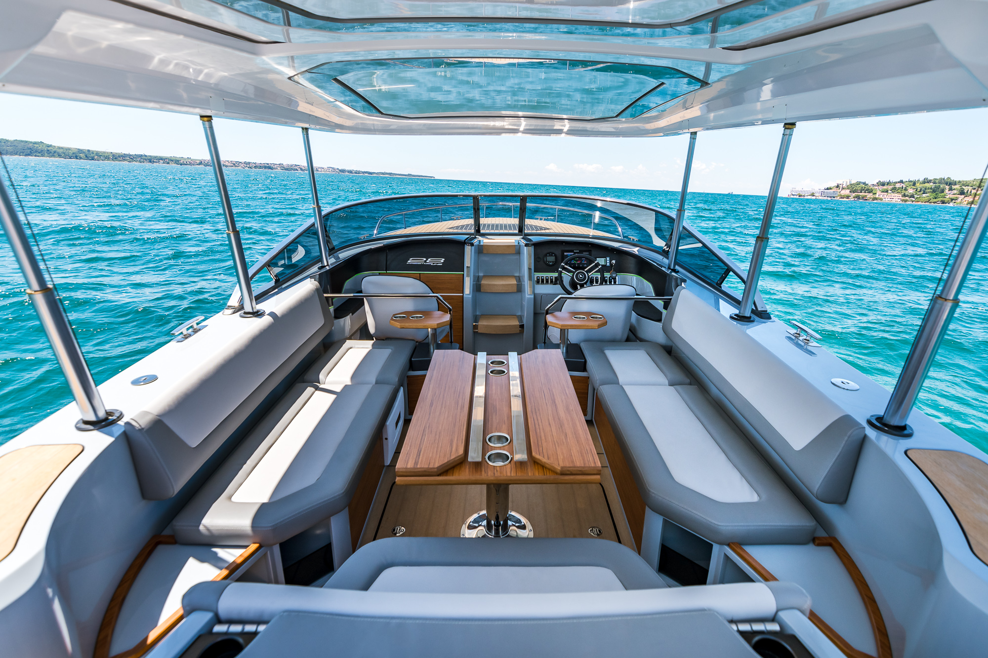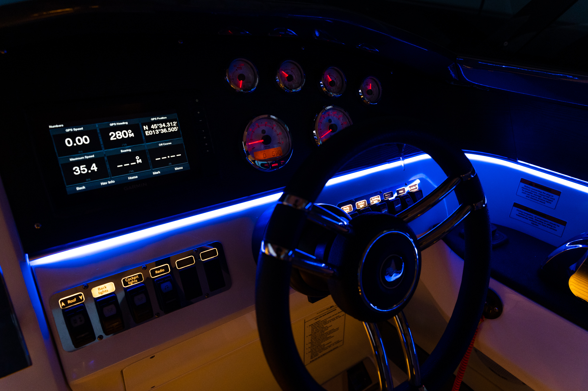 Certainly, the 32’s front console is something that cannot be missed with all the tailored details to feel like in the convertible car. Well studied position of all the instruments on the wooden inserts, upholstered sides in the premium marine upholstery and indirect illumination is something that makes the 32ft model recognizable, timeless and appealing vessel.