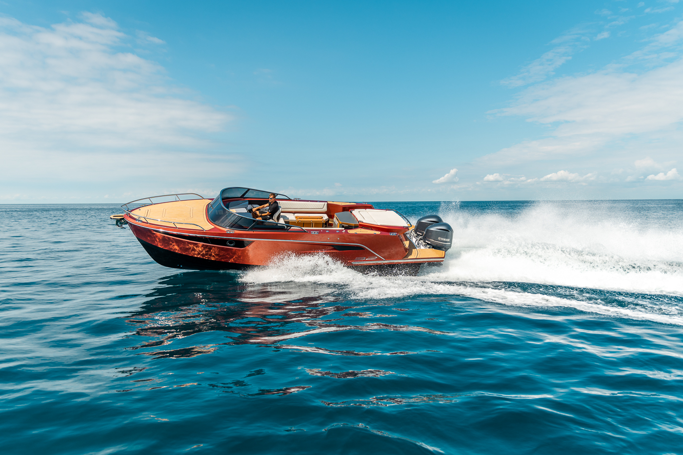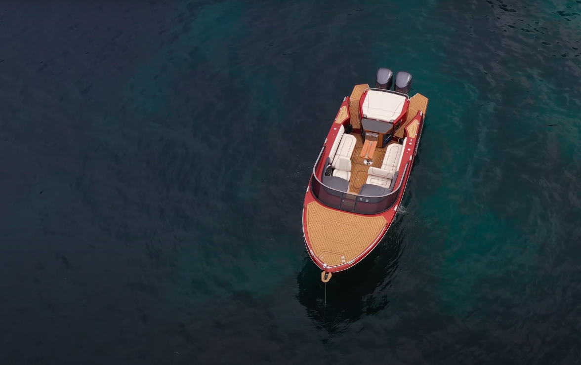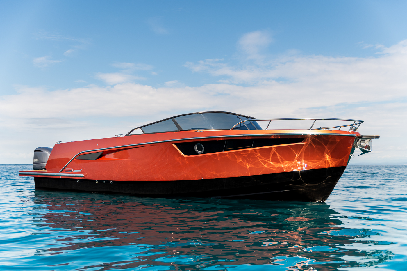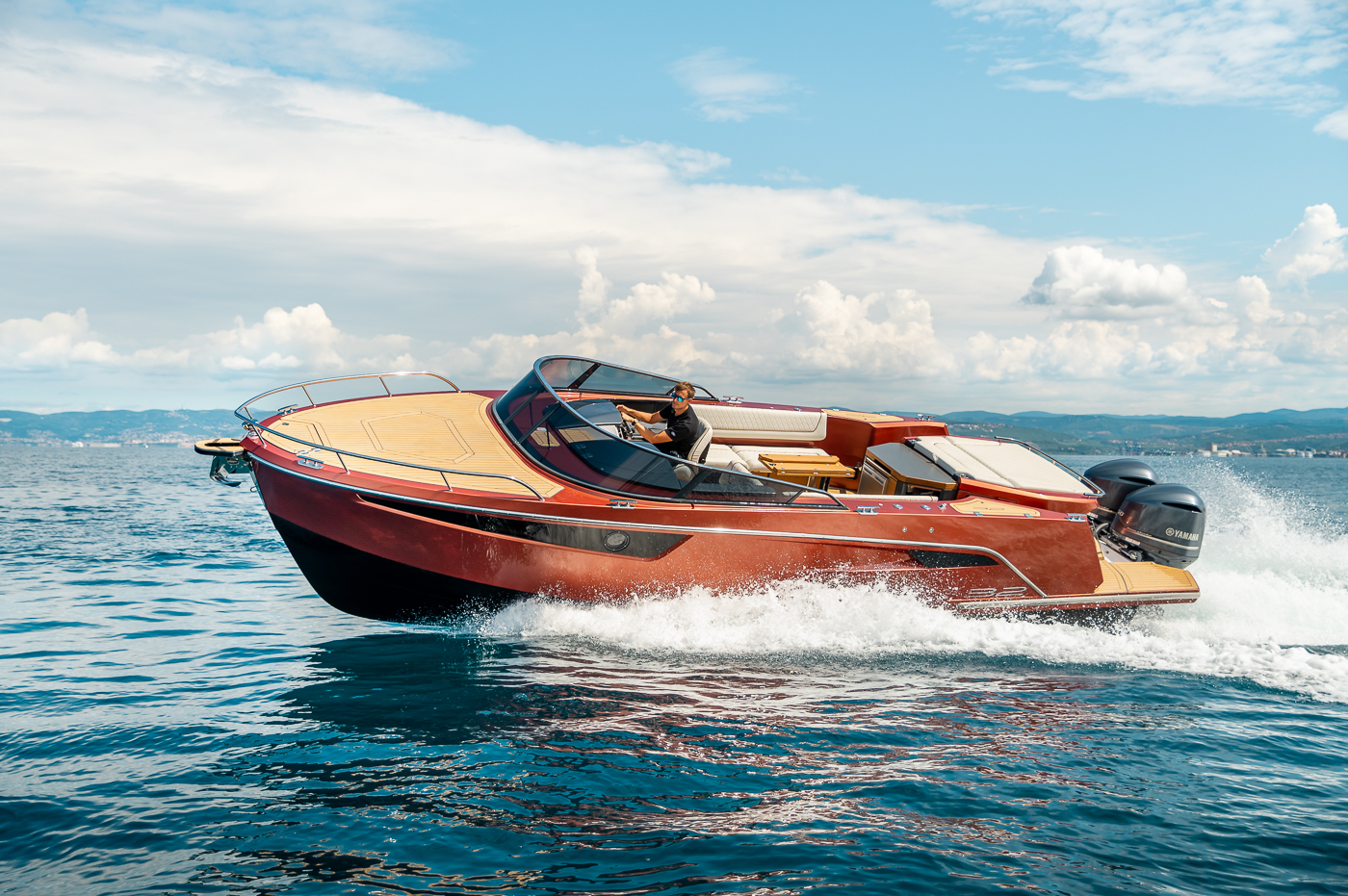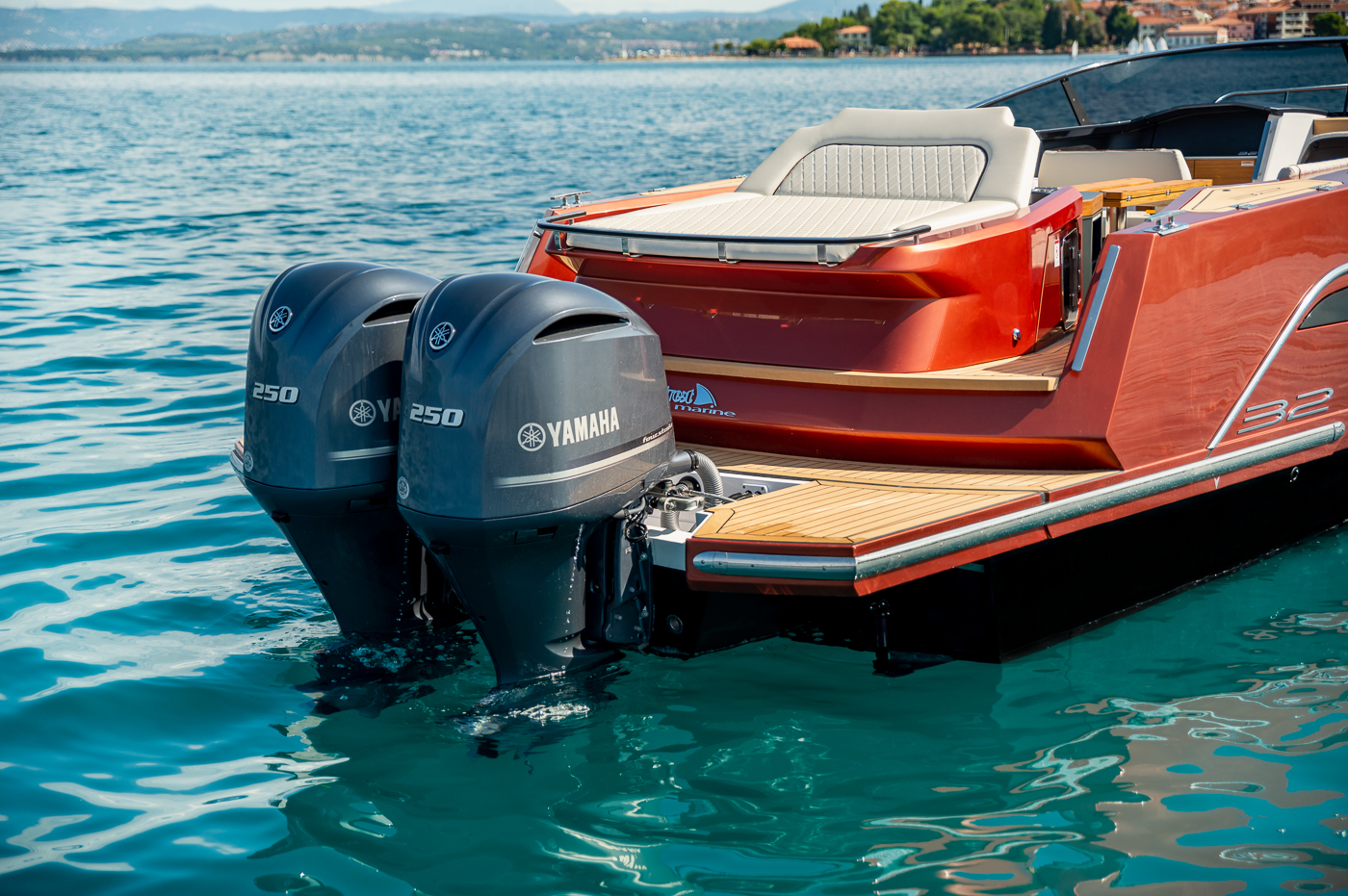 Certainly, the 32’s front console is something that cannot be missed with all the tailored details to feel like in the convertible car. Well studied position of all the instruments on the wooden inserts, upholstered sides in the premium marine upholstery and indirect illumination is something that makes the 32ft model recognizable, timeless and appealing vessel.