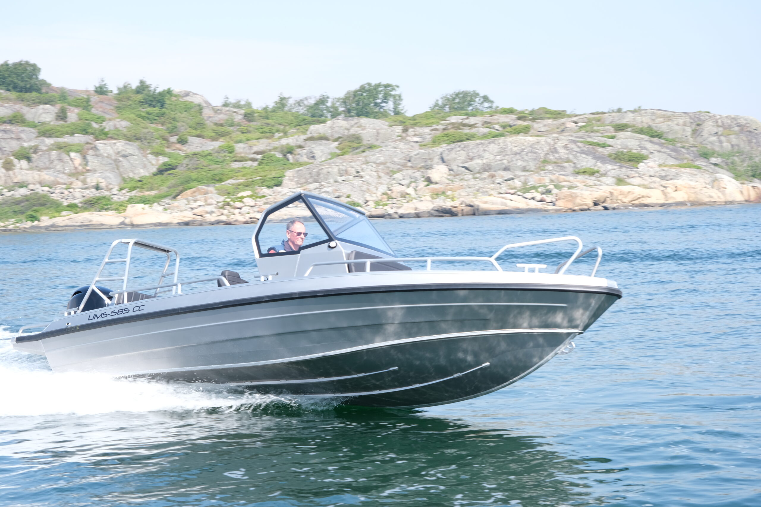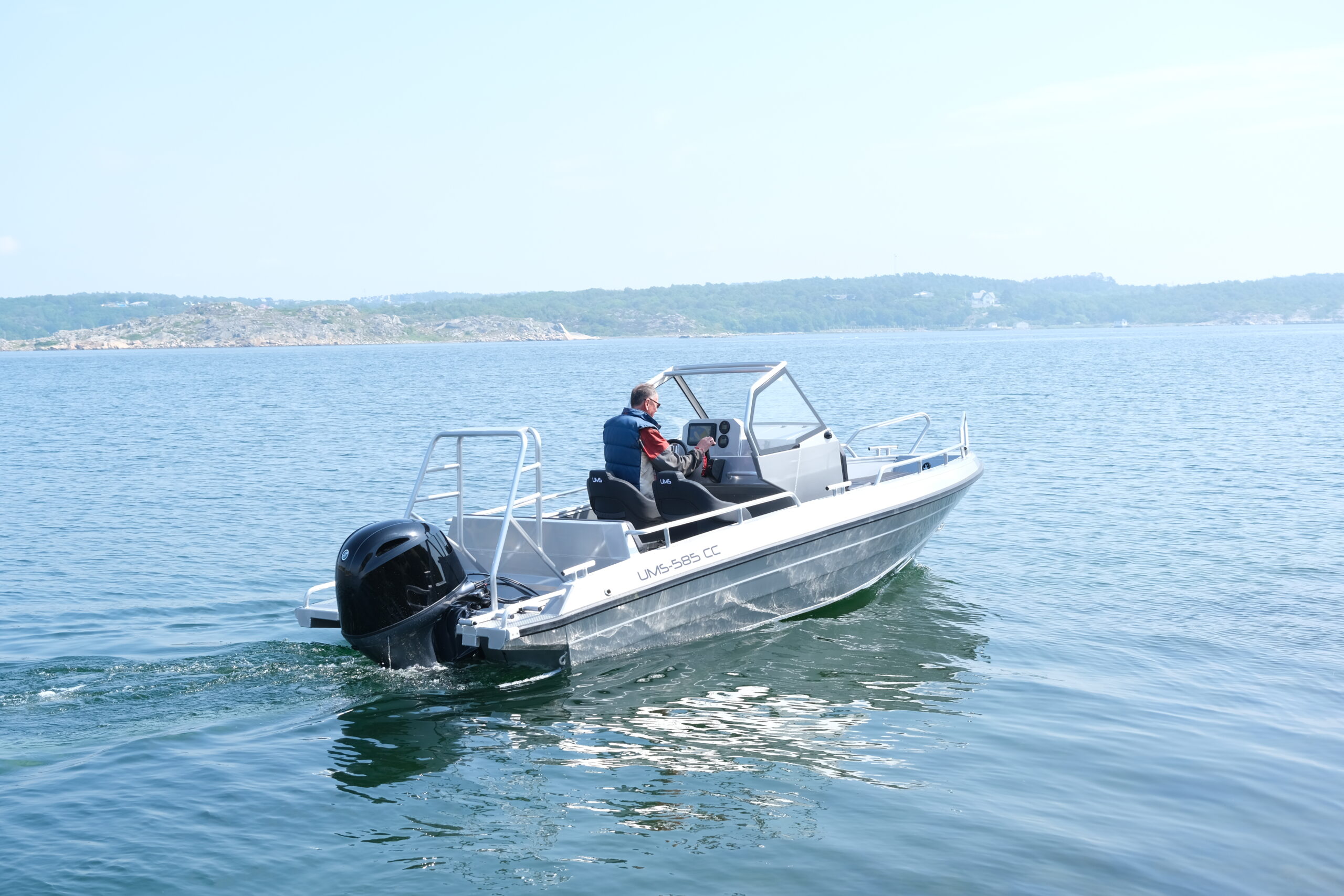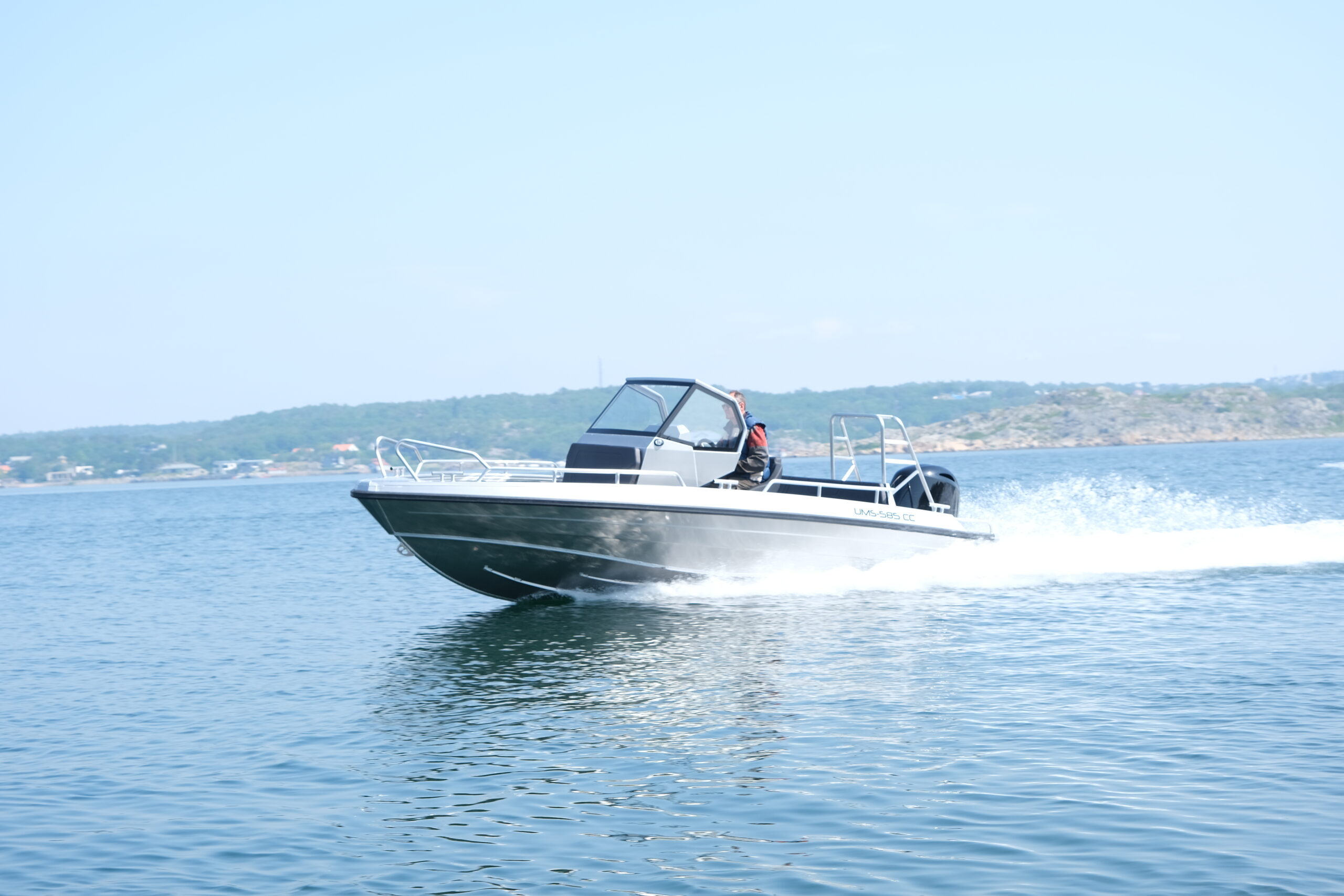 - EQUIPMENT: Fully welded aluminum hull / 120 liter fuel tank / Lockable bow storage compartment / Lockable bench seat / Storage box / Double center console / Safety glass windscreen / Hydraulic steering / Navigation lights / Bathing ladder / Fire extinguisher / Battery box / Main battery switch / Switch panel / Electric / Automatic bilge pump / Solid aluminum railing and cleats