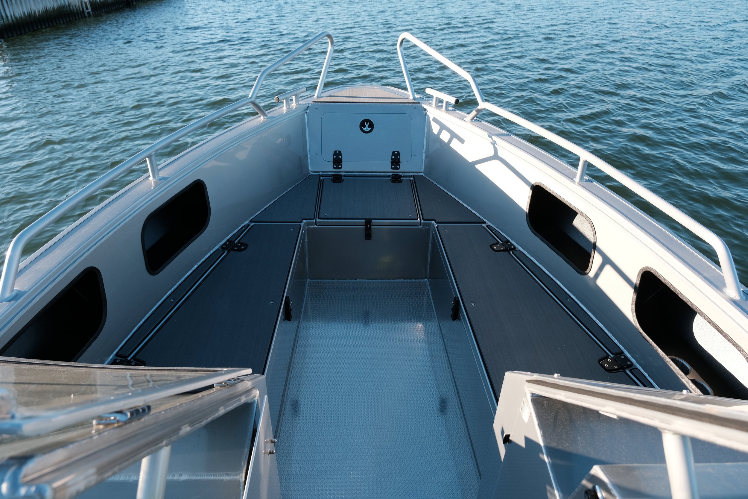 - EQUIPMENT: Fully welded aluminum hull / Fuel tank 180 liters / Lockable bow storage compartment / Lockable bench seat / Storage box / Double console with windshields / Windproof access door to bow / Hydraulic steering / Navigation lights / Battery box / Main battery switch / Switch panel / Electric bilge pump / Solid aluminum railing and cleats